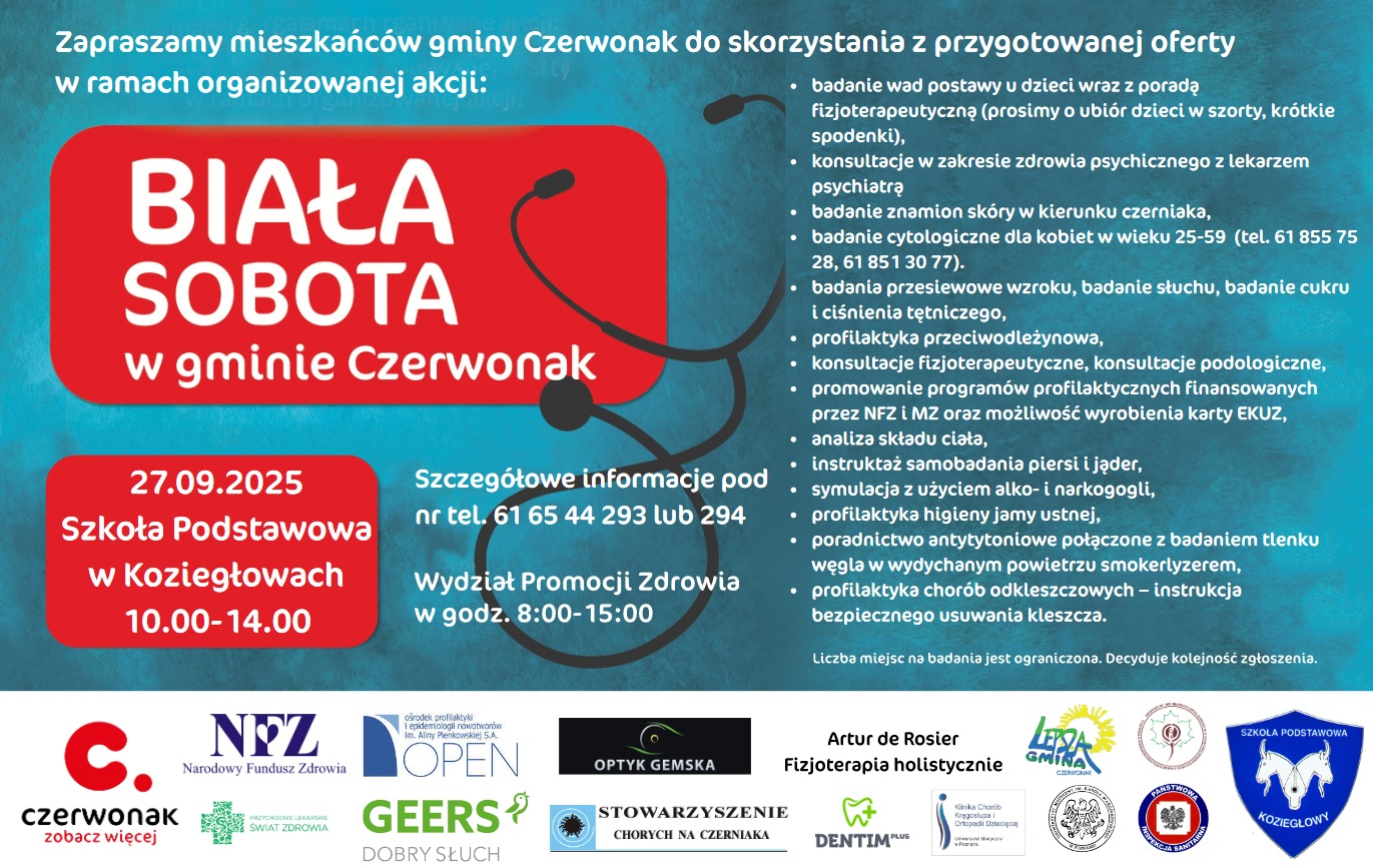 Zapraszamy mieszkańców naszej gminy do przybycia w sobotę 27 września 2025 r. na spotkanie ze specjalistami z różnych dziedzin i skorzystania z bezpłatnych badań, konsultacji i porad specjalistów. Biała sobota odbędzie się na terenie Szkoły Podstawowej w Koziegłowach godz. 10:00-14:00 W programie: 1. badanie wad postawy u dzieci wraz z poradą fizjoterapeutyczną (prosimy o ubiór dzieci w szorty, krótkie spodenki), 2. konsultacje w zakresie zdrowia psychicznego z lekarzem psychiatrą, 3. badanie znamion skóry w kierunku czerniaka, 4. badanie cytologiczne dla kobiet w wieku 25-59 (tel. 61 855 75 28, 61 851 30 77). 5. badania przesiewowe wzroku, 6. badanie słuchu, 7. badanie cukru i ciśnienia tętniczego, 8. profilaktyka przeciwodleżynowa, 9. konsultacje fizjoterapeutyczne, 10. konsultacje podologiczne, 11. promowanie programów profilaktycznych finansowanych przez NFZ i MZ, 12. możliwość wyrobienia karty EKUZ, 13. analiza składu ciała, 14. instruktaż samobadania piersi i jąder, 15. symulacja z użyciem alko- i narkogogli, 16. profilaktyka higieny jamy ustnej, 17. poradnictwo antytytoniowe połączone z badaniem tlenku węgla w wydychanym powietrzu smokerlyzerem, 18. profilaktyka chorób odkleszczowych – instrukcja bezpiecznego usuwania kleszcza. Liczba miejsc jest ograniczona. Decyduje kolejność zgłoszenia. Szczegółowe informacje pod nr tel. 61 65 44 293 lub 294. (Wydział Promocji Zdrowia), w godz. 8:00–15:00.