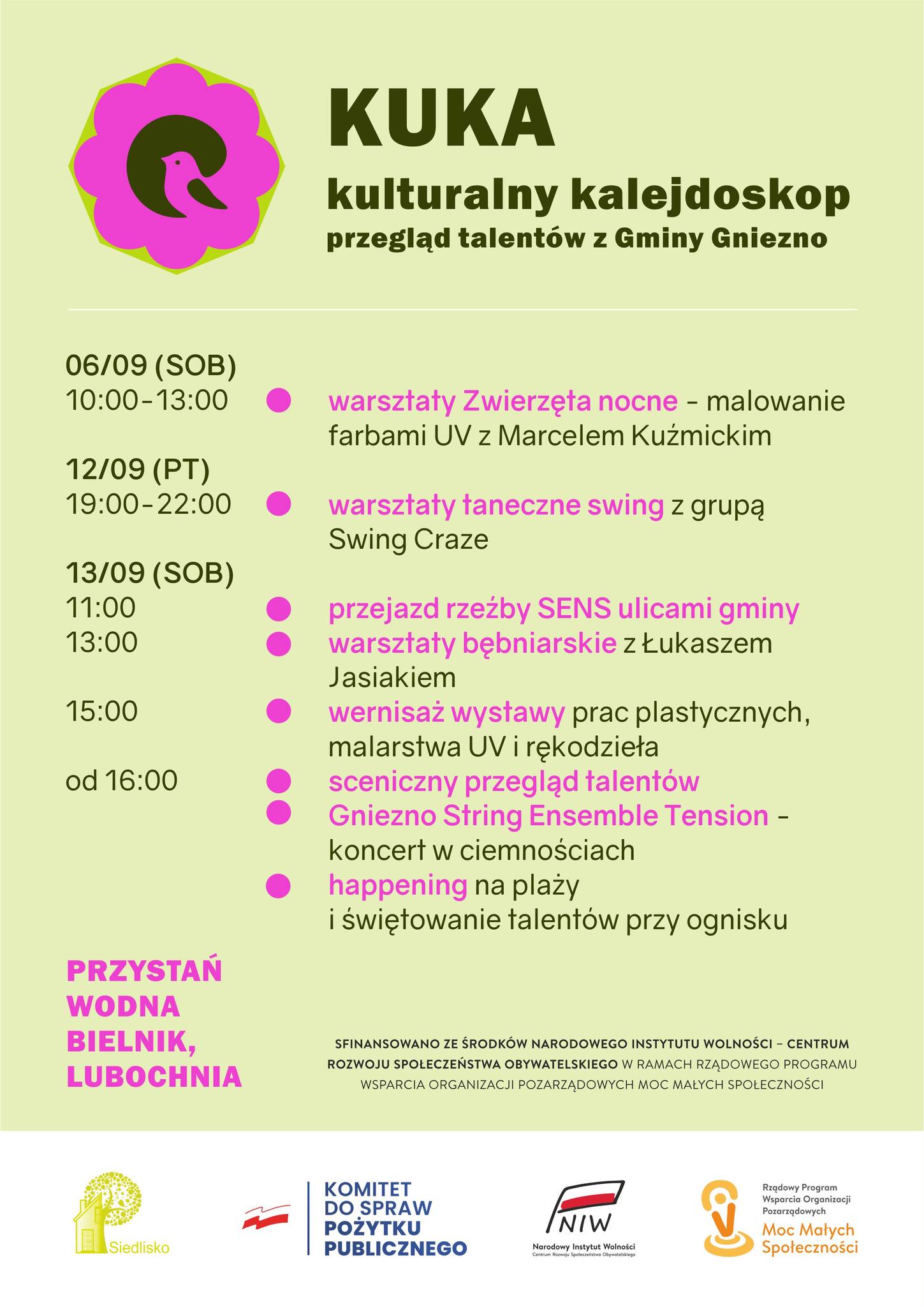 Masz ochotę spróbować czegoś nowego, rozwinąć swoje pasje i pokazać talent? Dołącz do projektu „KUKA – Kulturalny Kalejdoskop – SENSORIUM” realizowanego przez Stowarzyszenie Siedlisko! 👉 W programie: 🎨 Warsztaty plastyczne – od 10 r.ż. (limit 10 osób) 🥁 Warsztaty bębniarskie – od 10 r.ż. (limit 20 osób) 💃 Warsztaty taneczne – od 13 r.ż. (limit 20 osób) 🖼️ Wystawa rękodzieła – bez ograniczeń wiekowych 🌟 Przegląd talentów – bez ograniczeń wiekowych 📌 Każdy znajdzie tu coś dla siebie – można wziąć udział w jednej lub we wszystkich aktywnościach! 📅 Harmonogram rekrutacji: Warsztat plastyczny – do 4.09.2025 lub do wyczerpania miejsc Warsztat bębniarski – do 9.09.2025 lub do wyczerpania miejsc Warsztat taneczny – do 9.09.2025 lub do wyczerpania miejsc Przegląd talentów – do 7.09.2025 Wystawa rękodzieła – do 10.09.2025 ✅ Wystawa i przegląd talentów – BEZ LIMITU miejsc! Każdy, kto się zgłosi, zostanie przyjęty. ✅ Na warsztaty obowiązuje limit uczestników – decyduje kolejność zgłoszeń. 📲 Regulamin projektu znajdziesz na naszej stronie internetowej i w poście, poniżej. Formularze będą także dostępne na naszej stronie www i tutaj. ❗ Zgłoszenie udziału oznacza akceptację zasad określonych w Regulaminie. 👉 Nie zwlekaj – pokaż, co potrafisz! Projekt dofinansowano ze środków Narodowy Instytut Wolności - Centrum Rozwoju Społeczeństwa Obywatelskiego w ramach rządowego programu wsparcia organizacji pozarządowych “Moc małych społeczności”