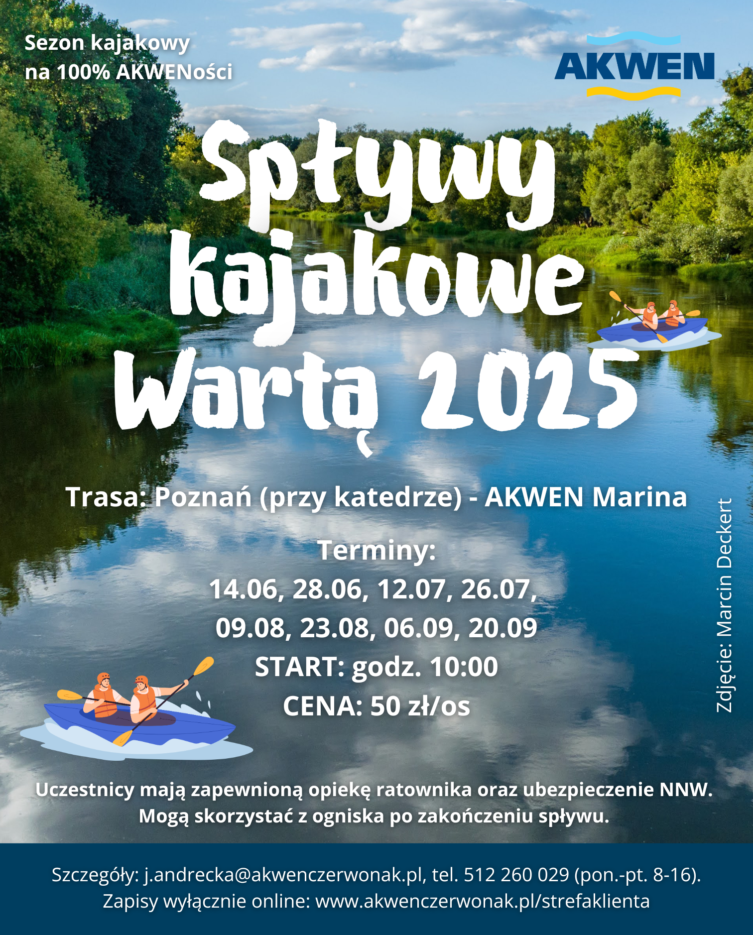 Spływy kajakowe Wartą 2025 - 14 czerwca, 28 czerwca, 12 lipca, 26 lipca, 9 sierpnia, 23 sierpnia, 6