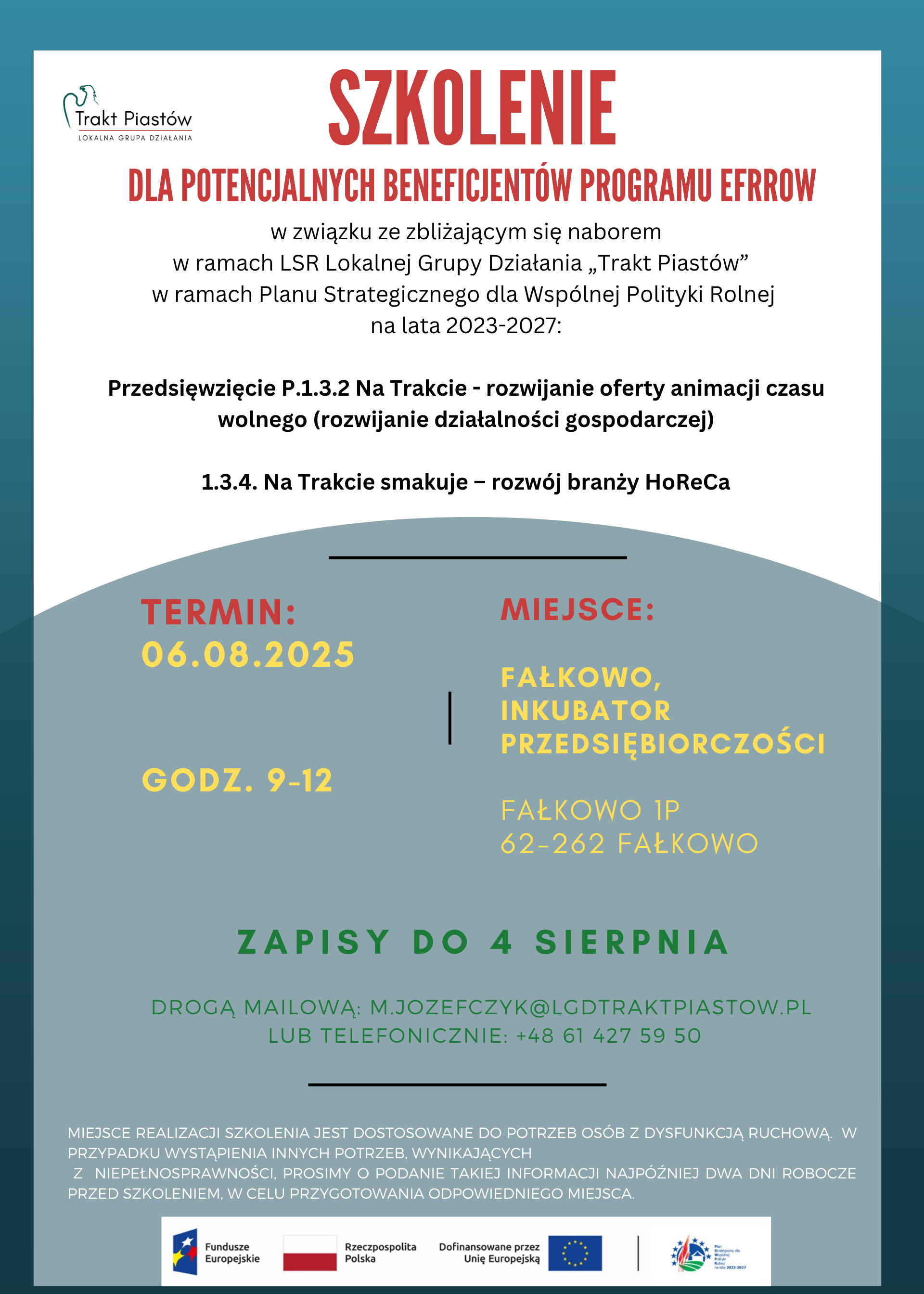W związku ze zbliżającym się naborem w ramach LSR Lokalnej Grupy Działania „Trakt Piastów” w ramach Planu Strategicznego dla Wspólnej Polityki Rolnej na lata 2023-2027: Przedsięwzięcie P.1.3.2 Na Trakcie - rozwijanie oferty animacji czasu wolnego (podejmowanie działalności gospodarczej) - ZAPRASZAMY NA SZKOLENIE.