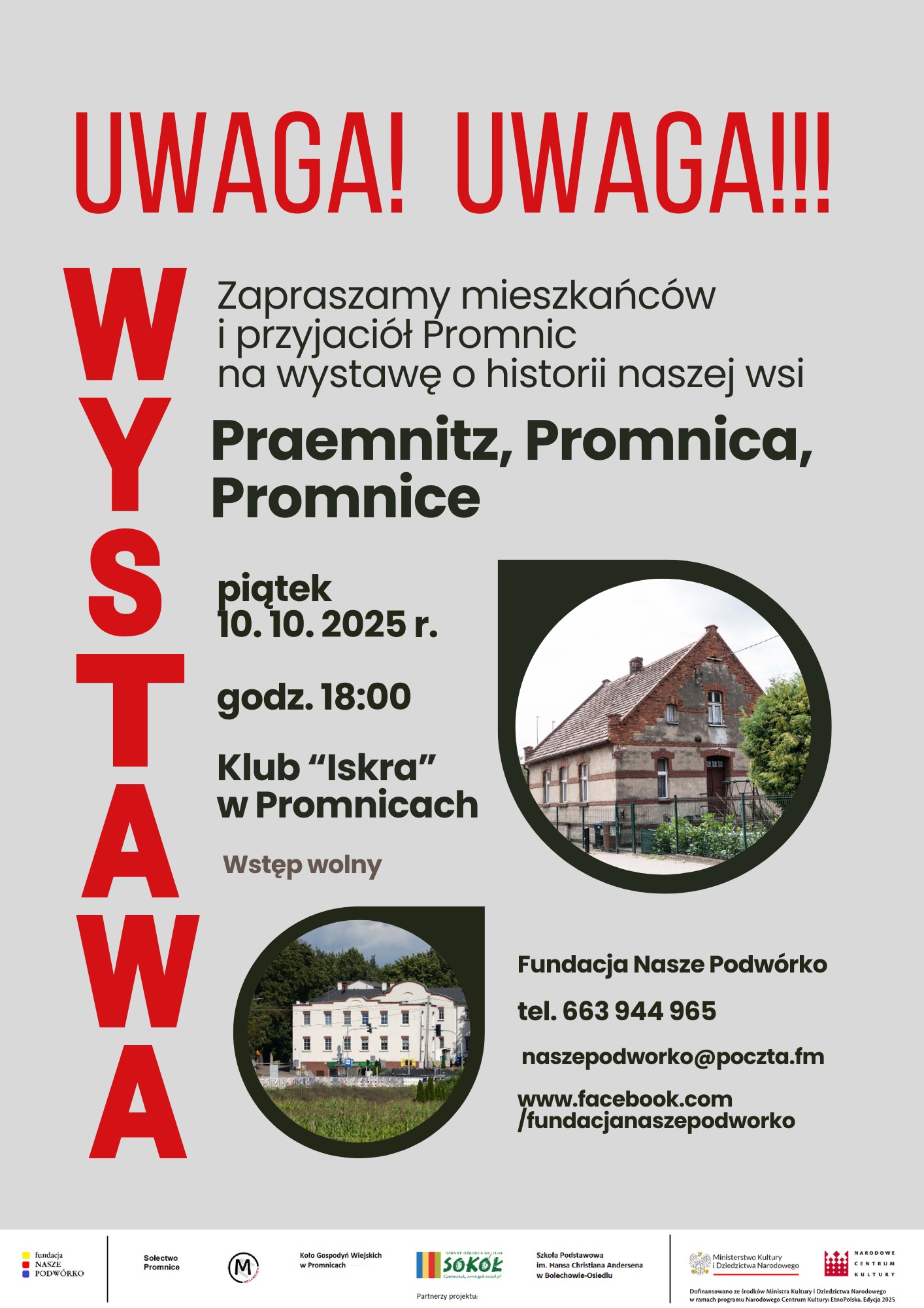 Fundacja Nasze Podwórko zaprasza mieszkańców i przyjaciół Promnic na wystawę o historii wsi - "Praemnitz, Promnica, Promnice". Wernisaż wystawy odbędzie się 10 października 2025 r. o godz. 18.00 przed Klubem "Iskra" w Promnicach. Wstęp wolny. Organizator: Fundacja Nasze Podwórko, tel. 663 944 965, naszepodworko@poczta.fm